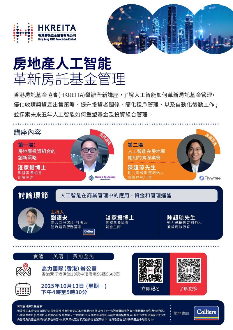 香港房托基金协会(协会)于2025年10月13日成功举办题为「房地产人工智能革新房托基金管理」的实体讲座, 吸引逾三十位业界人士参与,共同探讨人工智能如何革新房托基金管理,并剖析未来五年人工智能如何重塑基金及投资组合管理。