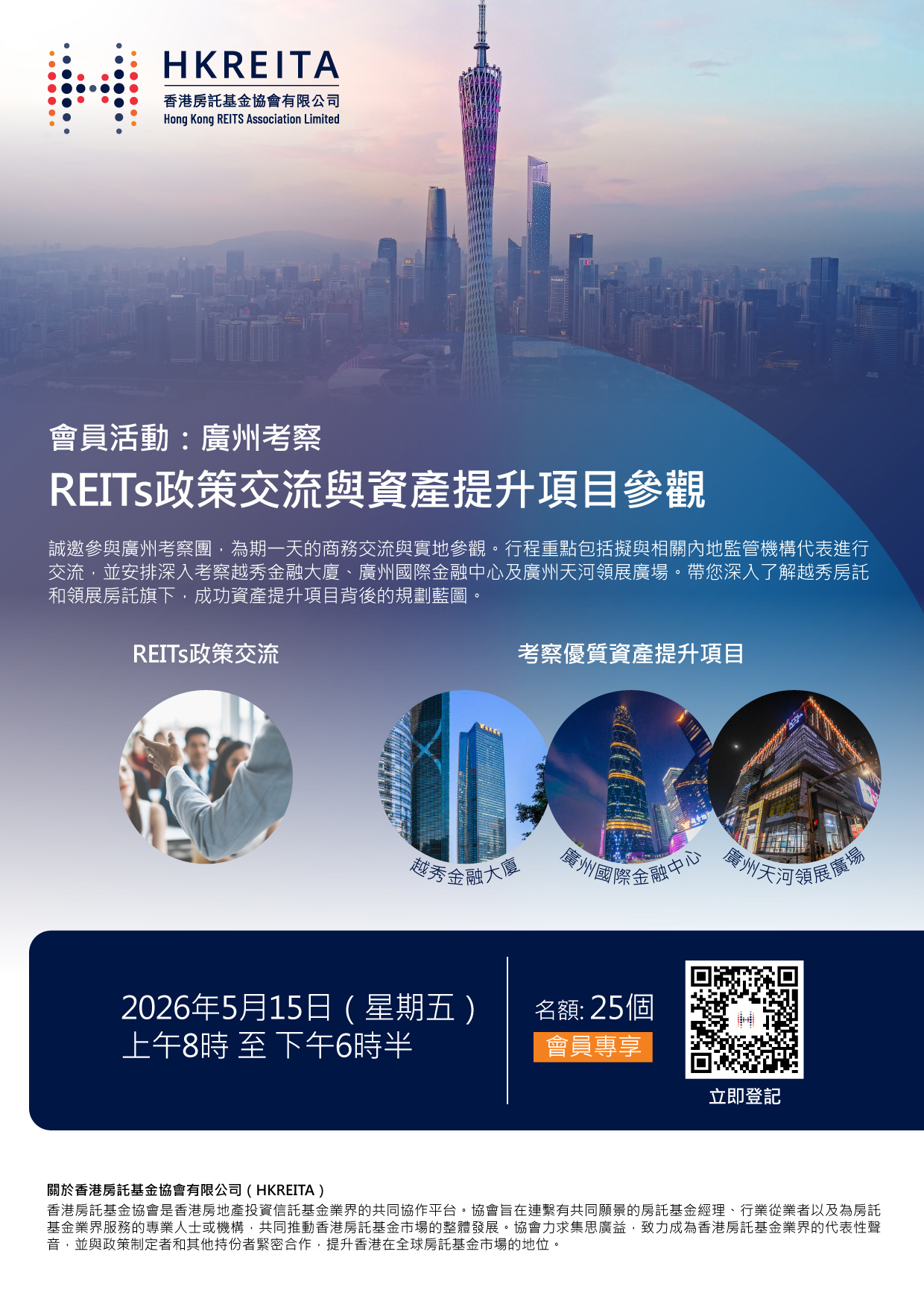 诚邀参与广州考察团,为期一天的商务交流与实地参观。行程重点包括拟与相关监管机构进行交流,并安排深入考察越秀金融大厦、广州国际金融中心及广州天河领展广场。带您深入了解越秀房托和领展房托旗下,成功资产提升项目背后的规划蓝图。